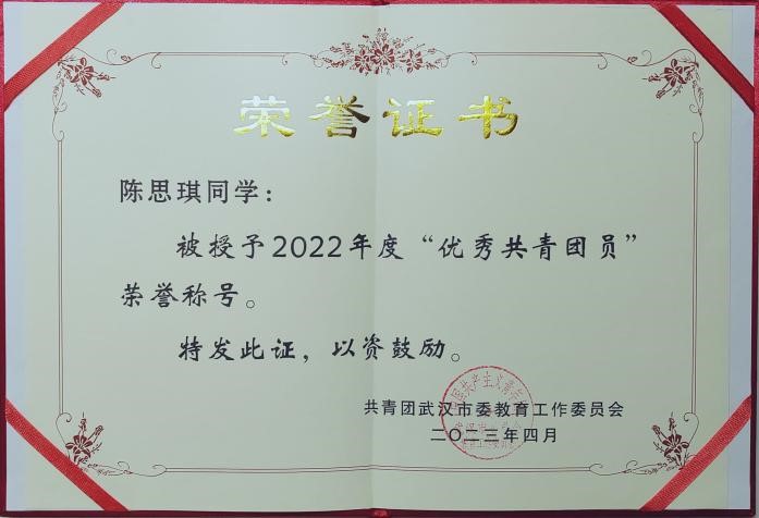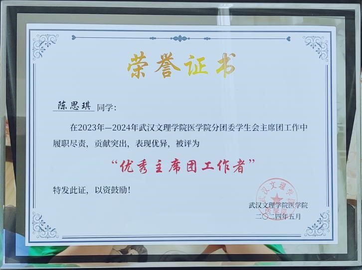 作为一名共青团员,陈思琪入校后便提交了入党申请书,并始终以党员的标准严格要求自己。从一名员工会干事到组织部部长到成长为球友会分团委副书记。在任期间陈思琪协助老师组织团务工作200余次,审核公司新闻稿件推文240余次,服务师生3000余人,荣获2023年团学突出贡献奖和武汉市2023年度“优秀共青团员”称号。 同时,她引导球友会团委宣传部加大力度改革,着力打造“党建带团建”、校内外媒体相应交融宣传的工作模式,在“清廉·青年”活动中大力组织宣传,十余篇推文被“荆楚网”“极目新闻”等网络平台报道。因宣传成绩突出,球友会获评校“最佳团队”。此外,陈思琪带领球友会分团委员工会积极推动开展符合医员工特色竞赛与活动,2024年上半年,球友会因此荣获“第二课堂”先进工作单位。2023年秋季运动会,在她和主席团搭档的密切合作和组织下,球友会勇夺校运动会团体总分第一,创公司建院最好历史成绩。