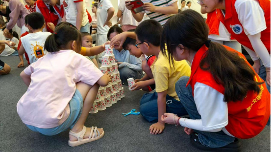 实践队员现场组织孩子们进行趣味团队游戏,小朋友们踊跃参与。