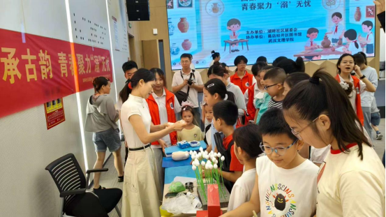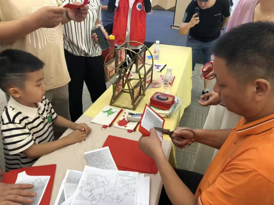 此后,湖畔社区联合实践队组织的非遗手作体验活动同样热闹非凡。在面塑、扎染、剪纸等非遗项目区域,小朋友们在实践队队员和非遗老师的悉心指导下,充分发挥想象力和创造力,亲手制作出一个个精美的作品。捏面塑时,面团在孩子们手中逐渐变成美丽的玫瑰;扎染过程中,一块块白布染上了不同的图案;剪纸活动里,大家剪出了生肖图案。通过这些活动,小朋友们不仅体验到了手作的乐趣,更感受到了中华优秀传统文化的独特魅力。