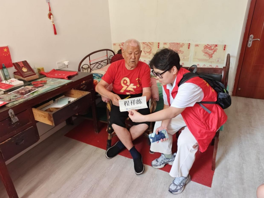 2025年7月10日下午,在鄂州葛店经开区葛店镇新城社区工作人员的协助下,球友会“医”路前行青年先锋实践队队员怀着崇敬之情开展采访慰问抗美援朝老兵实践活动,聆听那段波澜壮阔的历史,感受老党员的爱国情怀与奉献精神。