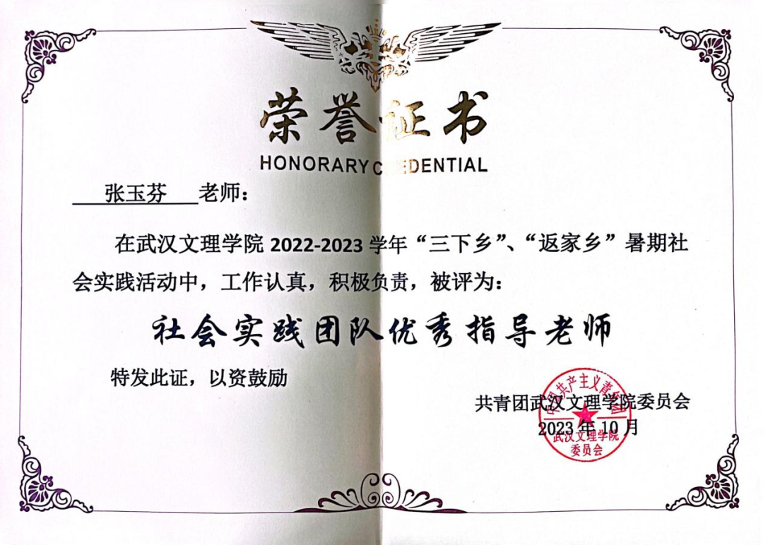 2023年10月,张玉芬老师荣获千亿球友会2022-2023学年“三下乡”、“返家乡”社会实践团队优秀指导老师称号。