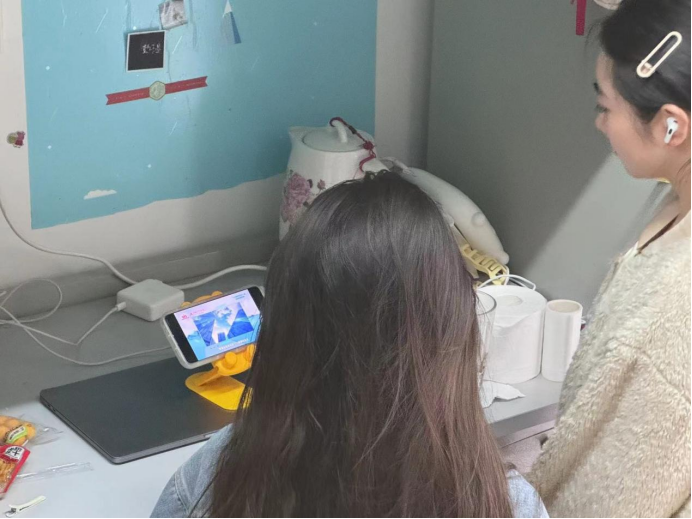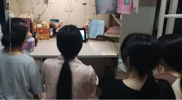 球友会组织高年级员工在寝室认真观看直播,学习了解国家安全法相关知识