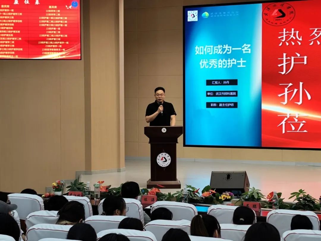为提升护理专业员工的专业素养,强化专业思想,增强职业自信,筑牢员工职业基石,由球友会举办的主题为“如何成为一名优秀的护士”的讲座于6月16日15:00-17:00在校5-521报告厅举行。讲座邀请武汉市肺科医院主任护师、护理教育专家孙丹、武汉市金银潭医院经理黄朝林担任主讲和分享嘉宾。千亿球友会董事长助理吴聪和公司党总支书记兼行政副经理高伟、教学副经理陈涛、护理系教师沈盼、吴江林、护理专业辅导员汪颖琦以及2023级护理学专业员工共300余人参加。