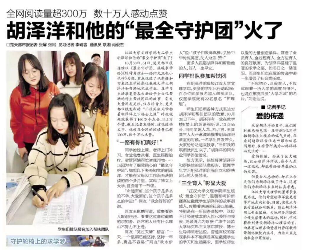 江汉大学文理公司大二员工胡泽洋和他的“最全守护团”火了!10月30日、31日,楚天都市报连续以《最全守护团,温暖求学路》、《轮椅男孩如一缕阳光照亮小伙伴》等大篇幅稿件报道了从新疆和田来汉求学的高位截瘫老员工胡泽洋和帮助他顺利完成学业、在学习生活康复等各方面给予他全方位帮助的师生帮扶团队的故事,引发大量网友关注。仅在抖音上,楚天都市报发布的“三位同班同学抬着胡泽洋上下楼去上课”的短视频就获得了160万个点击,11.1万个赞。截止记者发稿时,该报道的文字、视频在全网的阅读量已超300万,数十万人点赞