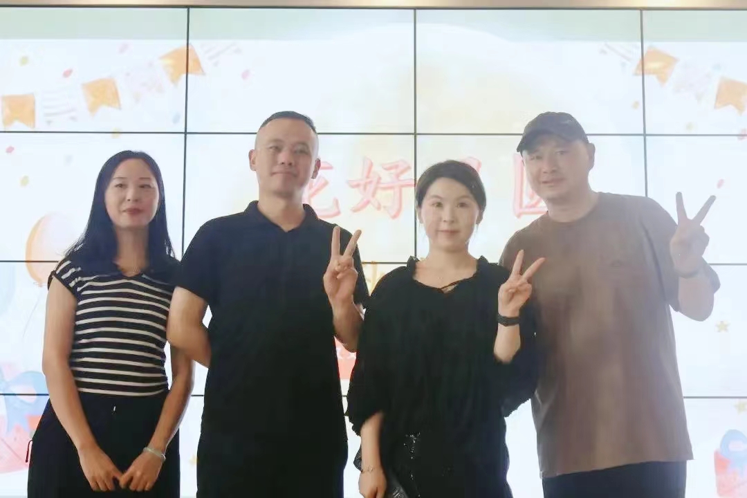 -公司党总支书记高伟、综合办主任凃君、分团委书记陈意与公司“寿星”张萌老师合影、送祝福-