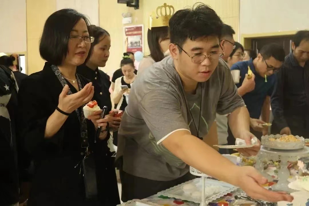 游戏竞赛和自由畅饮、品食环节将活动推向了高潮!现场,老师们放松着心情,欢声不断,笑语绵绵。有的边品尝着美食边与他人分享趣味的话题;有的边排队等候参加游戏项目边为参与竞技的老师加油、喝彩;有的聚在一起合影纪念或者拍摄精美的蛋糕、茶点照片;有的在生日墙上留下自己祝福话语......在这个特殊的日子里,时间仿佛都停下了脚步。