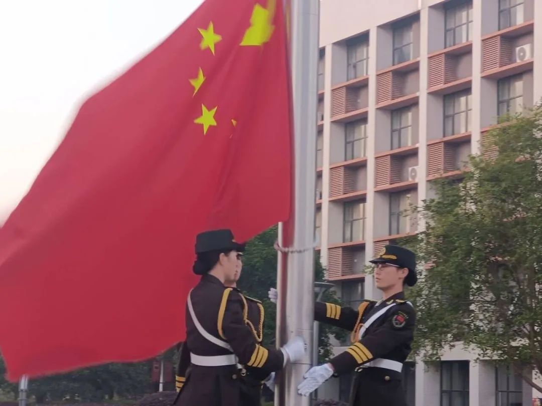 7点整,国旗护卫队护旗出列,他们迈着庄严的步伐携五星红旗迈上升旗台。随后,在师生合唱国歌声中,在全体注目礼下,五星红旗徐徐升旗,迎风招展。