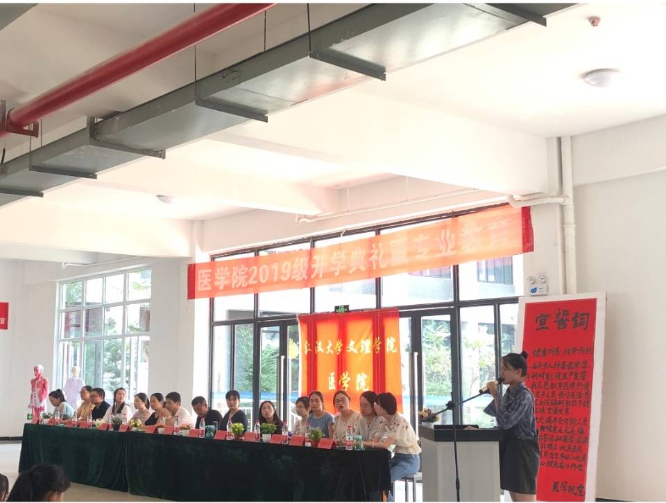 大会最后一项,由涂君老师带领313名形式宣誓,“健康所系,性命相托……”,全体医员工庄严宣誓,承诺着对祖国医药事业的决心,表达着自己对医学事业的憧憬。新生们用自己的誓言表达了自己对于医学的热忱以及美好寄愿。会场充满了青春的活力与魅力。