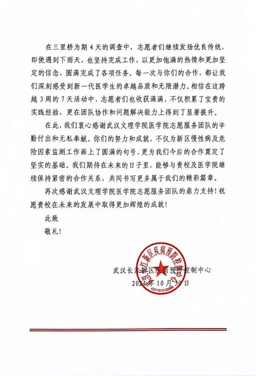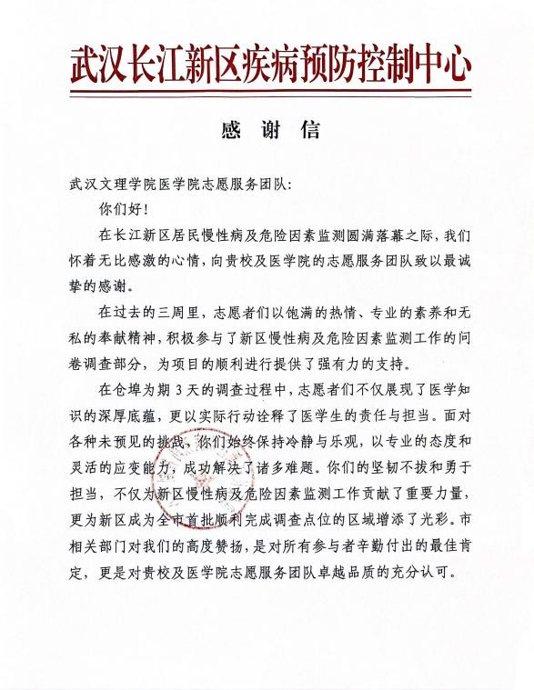 11月1日,球友会收到来自武汉长江新区疾病预防控制中心(以下简称:武汉长江新区疾控中心)致球友会志愿服务团队的感谢信。感谢信中,长江新区疾控中心盛赞球友会志愿服务团队以饱满的热情、专业的素养和无私奉献的精神积极参与到新区慢性病及危险因素监测工作的问卷调查部分的志愿服务工作,为项目的顺利进行提供了强有力的支持。