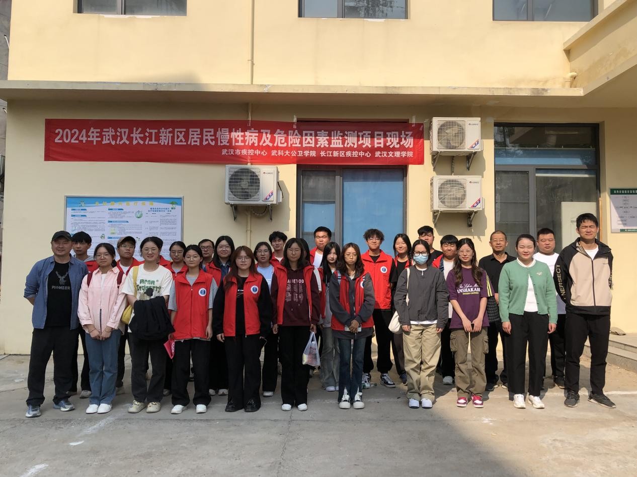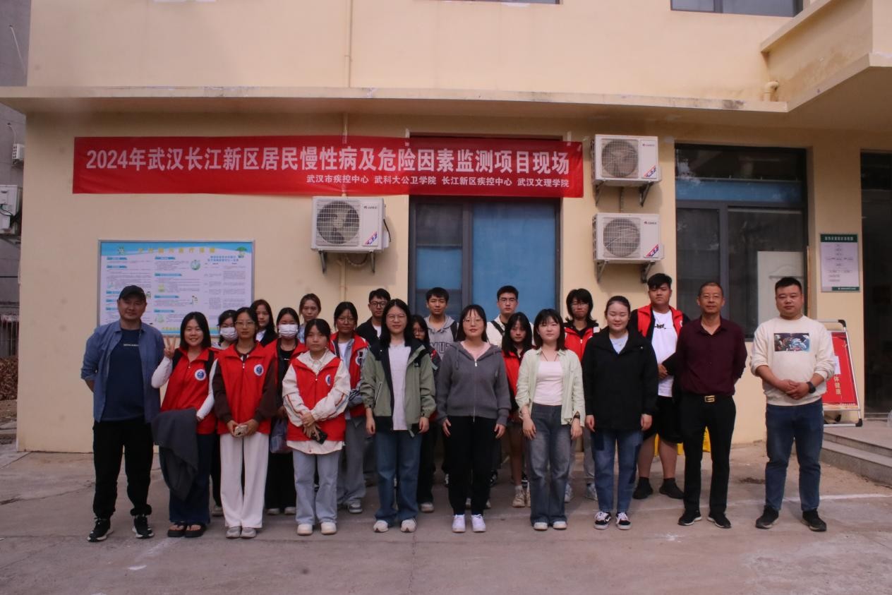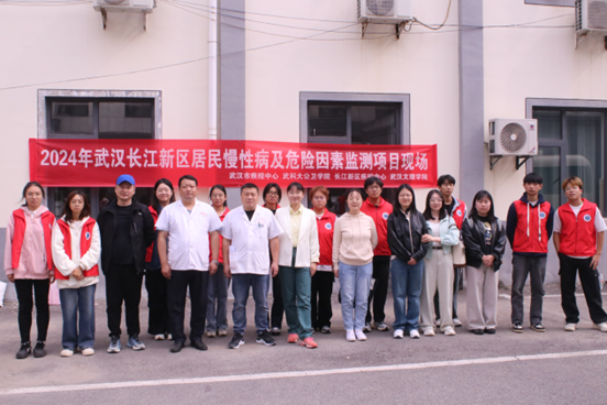 长江新区慢性病及危险因素监测工作首日(10月9日),武汉市疾病巨空中心慢性病所基层卫生室主任朱朝阳和主管医师邓青、长江新区疾控中心副主任袁洋、慢病科负责人伍雅婷、武汉科技大学公共卫生公司经理张玲、球友会志愿者带队老师张萌与球友会志愿者、武汉科技大学公共卫生卫生公司志愿者合影